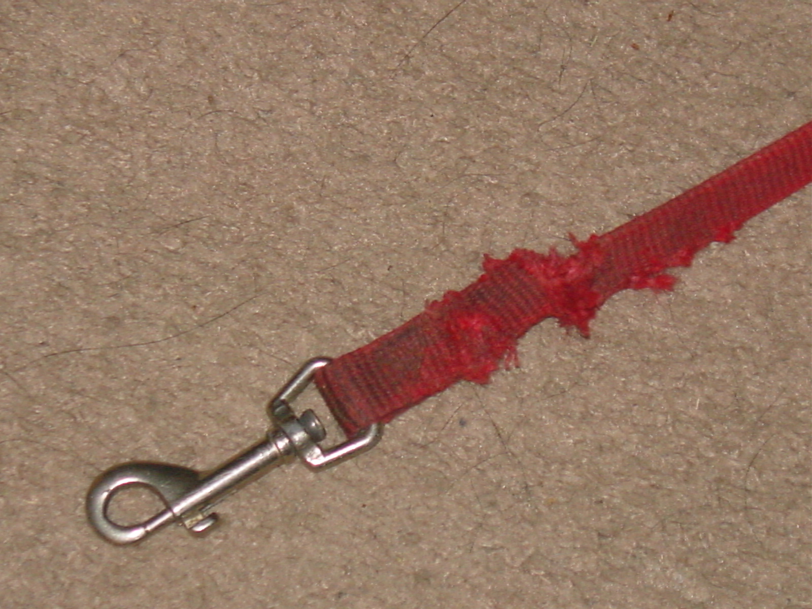 Got a puppy or adult dog that chews on its leash during a walk? Here’s how to fix that behavior. Get a double-ended bolt snap and a choke chain sized appropriately for your dog. E.g., get a small snap and chain for a small dog, a medium snap and chain for a medium to large dog, a large snap and chain for a large to giant dog.